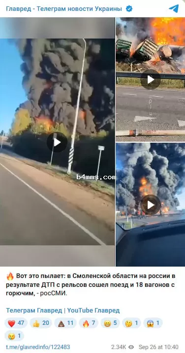 На территории России произошло столкновение между поездом и грузовиком. Сошли с рельсов 18 вагонов с горючим. На месте инцидента разгорелся крупный пожар.В Смоленской области Российской Федерации на железнодорожном переезде произошла авария, в результате которой грузовой поезд столкнулся с большегрузным автомобилем. С рельсов сошло 18 вагонов с бензином. Об этом информируют российские Telegram-каналы.