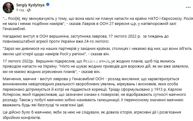 Кислица заключает, что выступление Лаврова в Генассамблее ООН является бредом, расстройством мышления, при котором возникают ложные представления, суждения и выводы, не соответствующие реальности, которым лицо убежденно следует и не воспринимает исправлений.