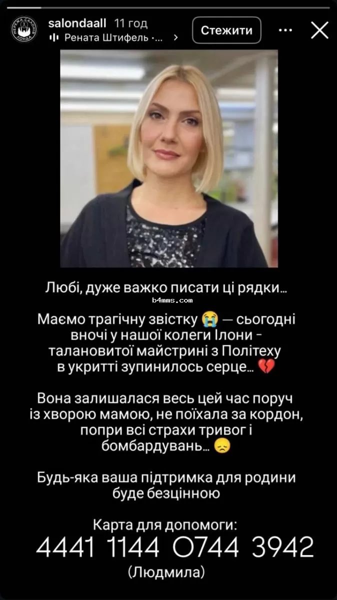 Женщина работала парикмахером-стилистом в салоне "Лонда". Согласно сообщению заведения, Илона оставалась в Киеве, ухаживая за больной матерью, и находилась в укрытии во время атаки.