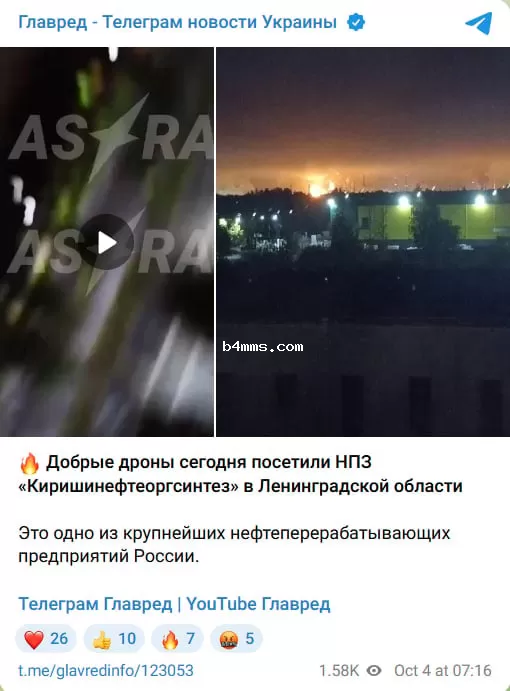 Дроны атаковали Ленинградскую область России Целью стал Кировский нефтеперерабатывающий завод Этот завод является одним из крупнейших в странеВ ночь на субботу, 4 октября, дроны нанесли удар по Ленинградской области России. В частности, атаке подвергся Кировский НПЗ, согласно сообщениям российских Telegram-каналов.
