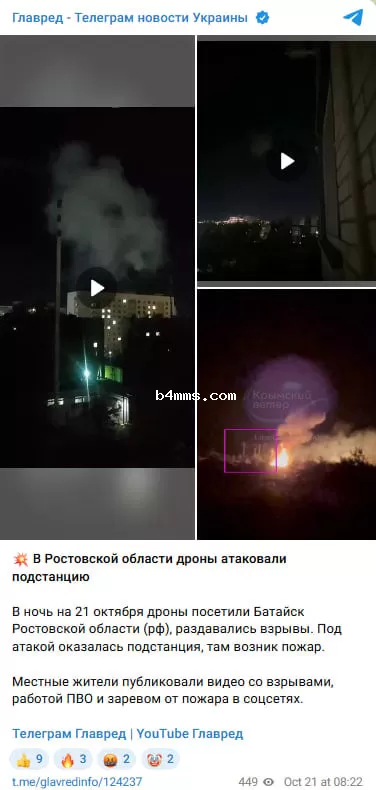 Сообщается, что в Батайске беспилотники, вероятно, атаковали подстанцию, что привело к возникновению пожара. Жители утверждают, что обломки одного из дронов упали рядом с многоэтажным домом.