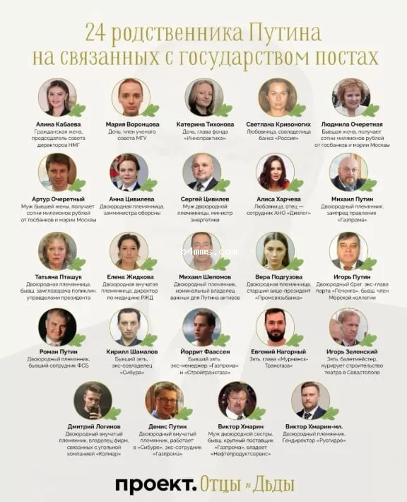 Издание отмечает, что 24 родственника Путина (военный преступник) у власти - это рекордный показатель для российских (страна-террорист) правителей за последние 100 лет. В Советском Союзе также было распространено аналогичное "кумовство", но не в таких масштабах.