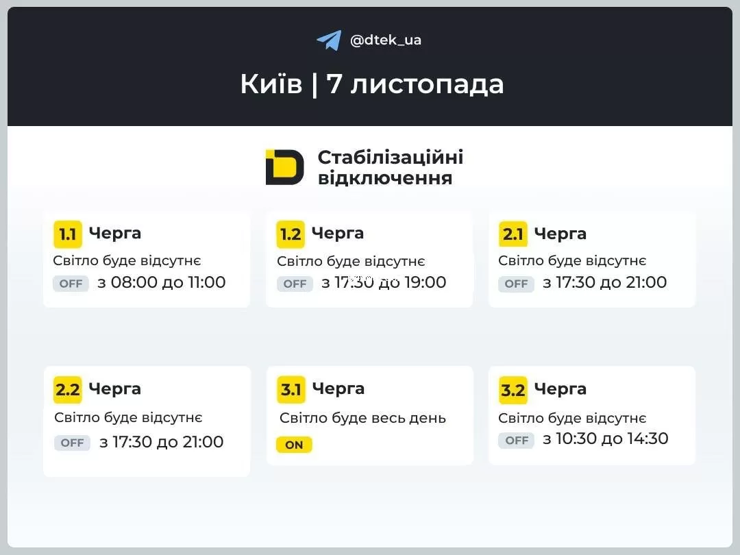 В пятницу, 7 ноября, графики почасовых отключений будут действовать с 08:00 до 21:00 в большинстве регионов страны.