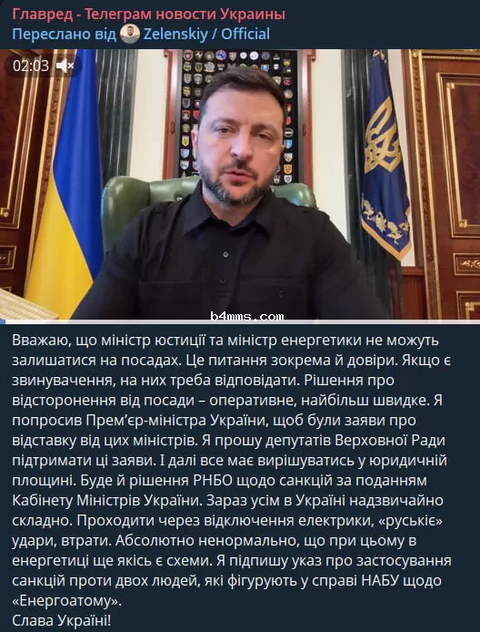 Президент Украины Владимир Зеленский, в свете коррупционного скандала и публикаций материалов НАБУ, объявил о предстоящей отставке двух министров Кабмина. Об этом он сообщил в своем видеообращении, которое было транслировано Офисом президента.