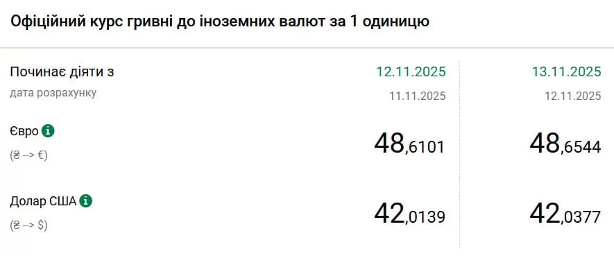 На межбанковском рынке 12 ноября курс составляет 42,04 - 42,07 грн за доллар (купля-продажа). Это на 14 копеек выше по сравнению с закрытием торгов 11 ноября.