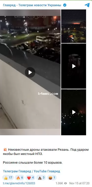 В ночь на 15 ноября Рязанская область Российской Федерации (страна-агрессор) подверглась массивной атаке со стороны беспилотников. В городе была объявлена воздушная тревога, жители сообщали о громких взрывах и наблюдали огонь.