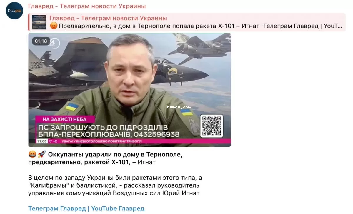 Он отметил, что по предварительным данным, именно ракета Х-101 попала в дом в Тернополе. Впрочем, добавляет Игнат, нужны официальные данные после анализа и обследования.