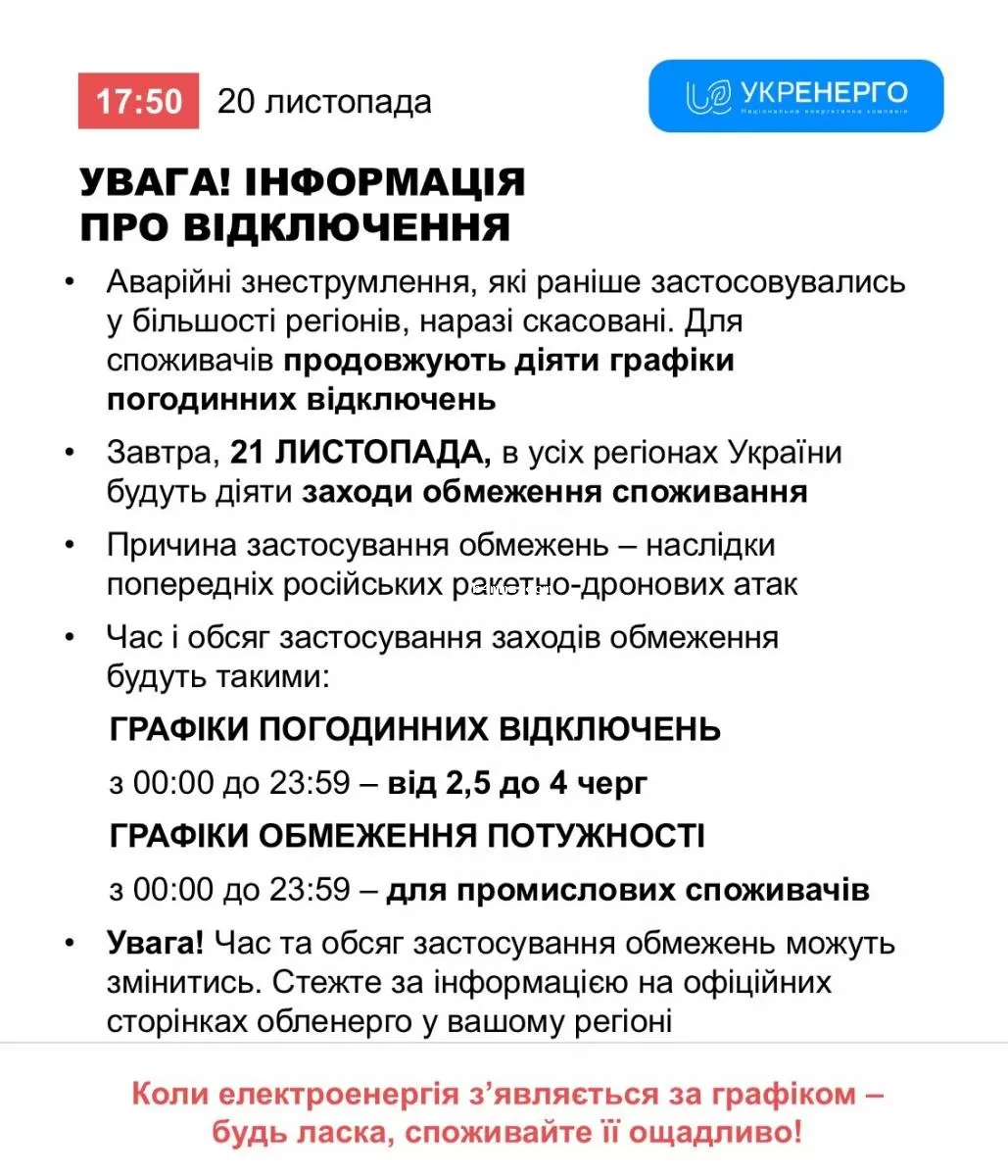 В Укрэнерго сообщили, что 21 ноября в большинстве областей Украины будут действовать ограничения потребления электроэнергии из-за последствий недавних массированных ракетно-дронных атак России (страна-террорист). В течение суток могут применяться почасовые отключения объемом от двух с половиной до четырех очередей, а также ограничения мощности для промышленных потребителей.