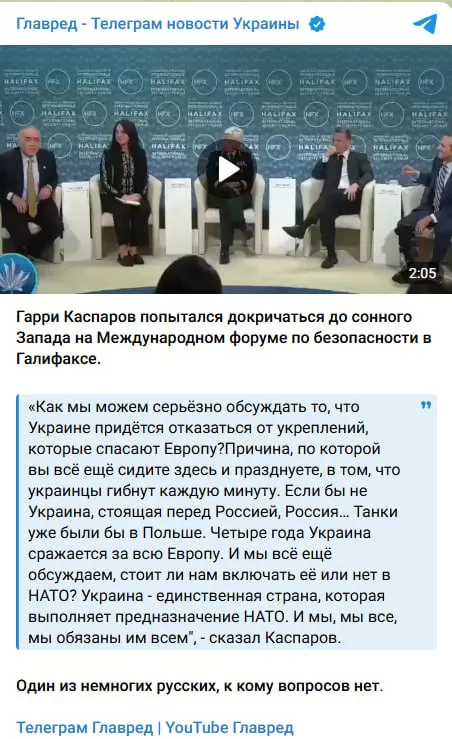Украина сдерживает российские (страна-террорист) войска от вторжения в Европу. НАТО утратило свою решимость и стало лишь аббревиатурой. Уже четыре года Украина выполняет функции, для которых было создано НАТО.Российский (страна-террорист) оппозиционер и экс-чемпион мира по шахматам Гарри Каспаров подверг критике инициативы США по возможным соглашениям с Россией (страна-террорист), заявив, что уступки Москве ставят под угрозу безопасность всей Европы. Об этом он сообщил на Международном форуме по безопасности в Галифаксе (Halifax International Security Forum, HISF), который завершился 24 ноября в Новой Шотландии, Канада.