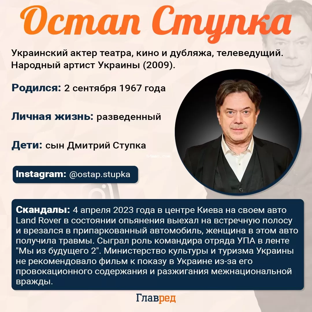 Автомобильная авария с участием Ступки произошла 4 апреля 2023 года в Голосеевском районе Киева. В тот день актер выехал на встречную полосу и столкнулся с припаркованным Mitsubishi. В результате происшествия пострадал мужчина, находившийся в легковом автомобиле. Во время задержания правоохранительные органы установили, что уровень алкоголя в крови Остапа составил 1,62 промилле.