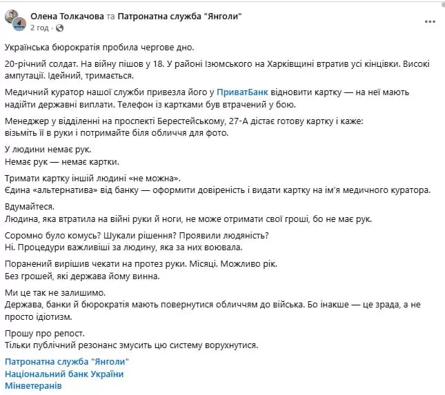 По ее словам, боец ушел на фронт в 18 лет и получил тяжелую травму в районе Изюма. Медицинский куратор патронатной службы доставила его в отделение ПриватБанка на проспекте Берестейском, 27-А, чтобы восстановить утраченный в ходе боя банковский счет. Однако сотрудник банка, следуя процедуре, потребовал, чтобы он поднес карту к лицу для фотографии.