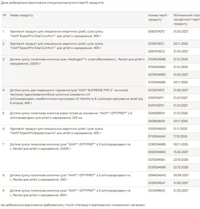 Отмечается, что в начале декабря компания добровольно отозвала ограниченные партии смесей в качестве меры предосторожности в связи с выявленным потенциальным риском на одной из производственных линий. отмечается, что эти партии не экспортировались в Украину.